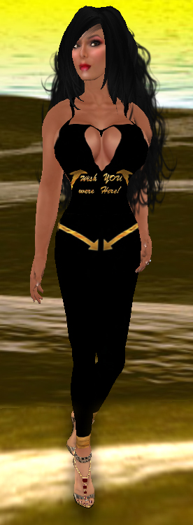 Description: A black catsuit with arrows & "Wish You Were Here" logo.