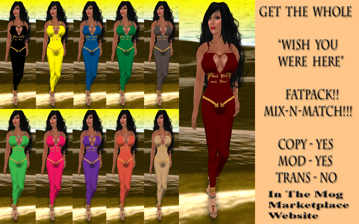 Description: A large colorful mix-n-matchable pack of catsuits with arrows and "Wish You Were Here" Logo